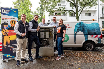 BU: Markus Eriksson, Head of Communication (Bahnhof Nätverk), Philipp Riederer von Paar, Geschäftsführer (Bahnhof Nätverk Deutschland), Marco Sick, Geschäftsführer (Eurofiber), Rüdiger Gerndt, Partner Manager Wholesale (Eurofiber) und Frau Bauer (Erste Kundin von Bahnhof Nätverk Deutschland) freuen sich über den ersten Anschluss in Berlin.